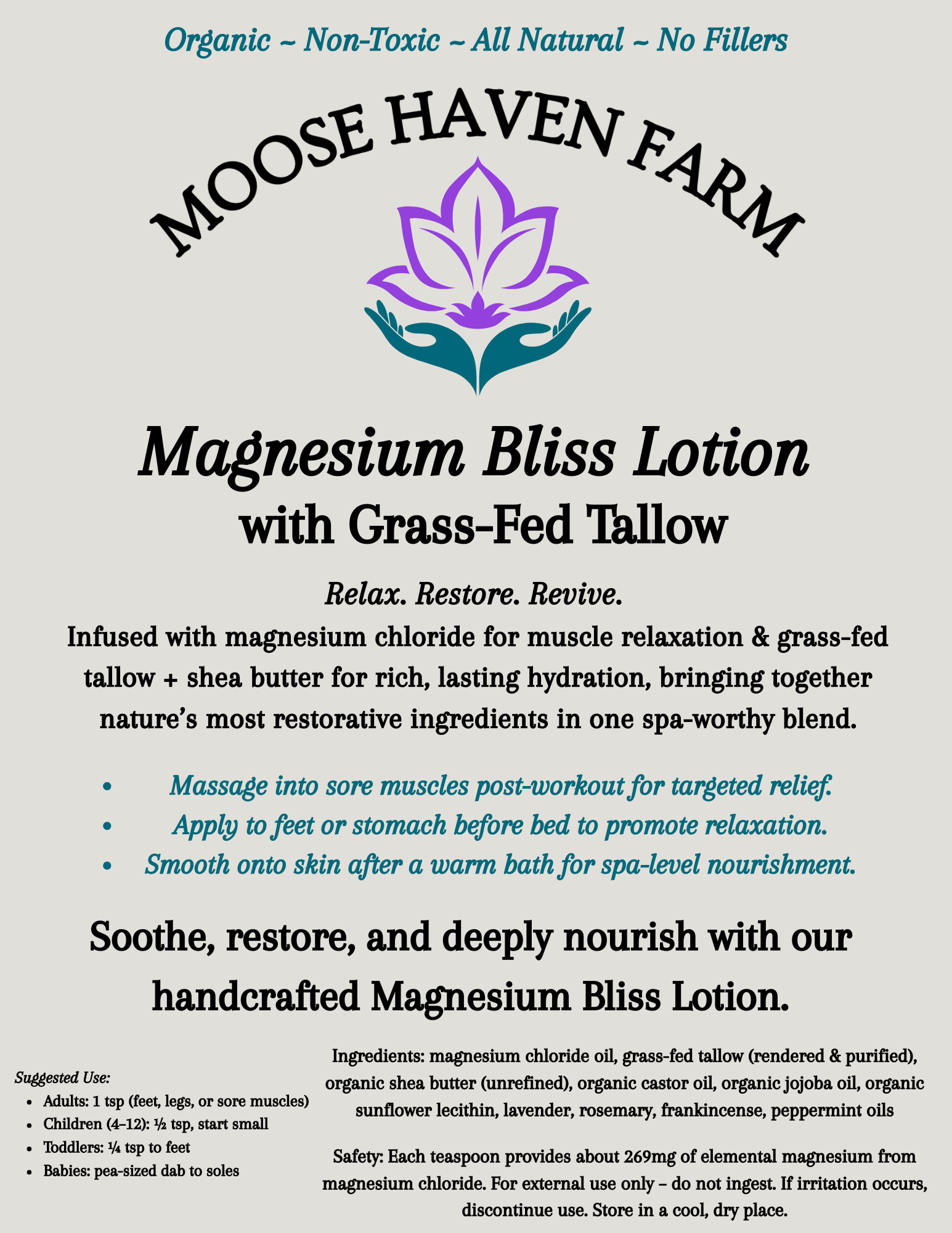 Infused with magnesium chloride for muscle relaxation and grass-fed tallow + shea butter for rich, lasting hydration, this lotion brings together nature’s most restorative ingredients in one spa-worthy blend.